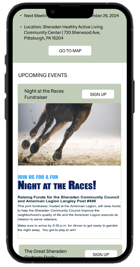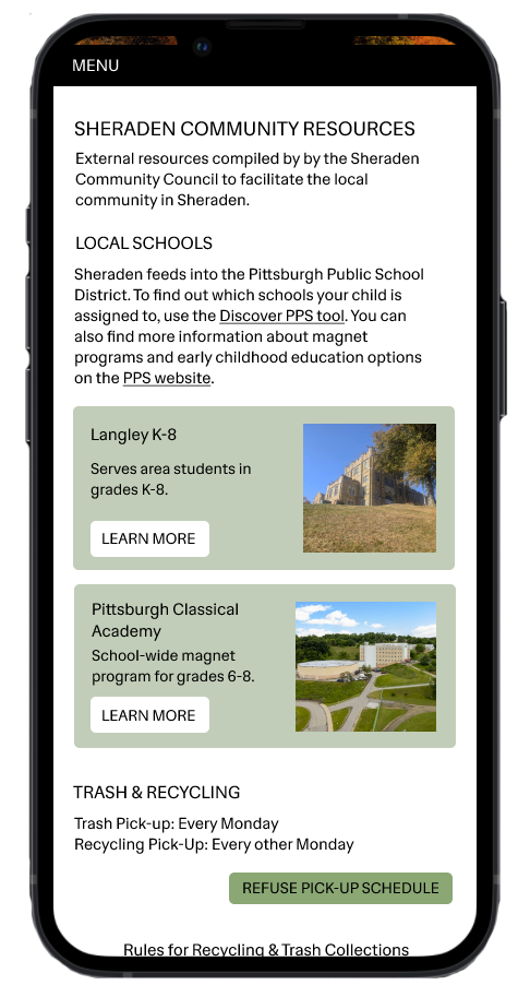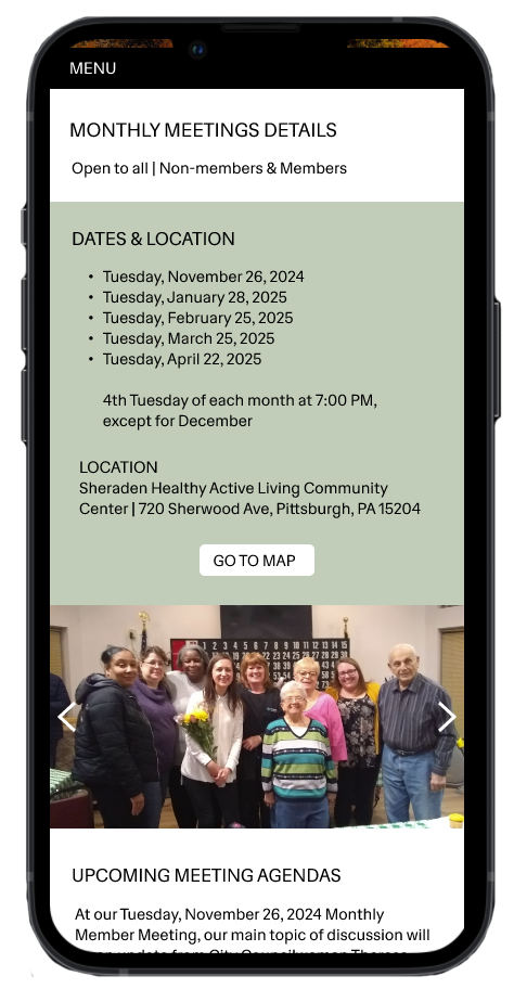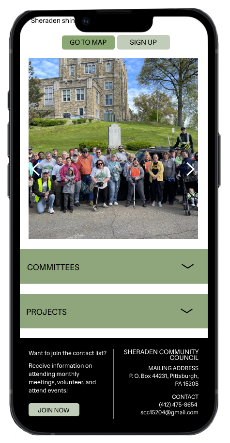 Overall, the client was very pleased with the outcome of the website and was excited to allow for the Sheraden residents to have a more accessible platform to get involved in the community.